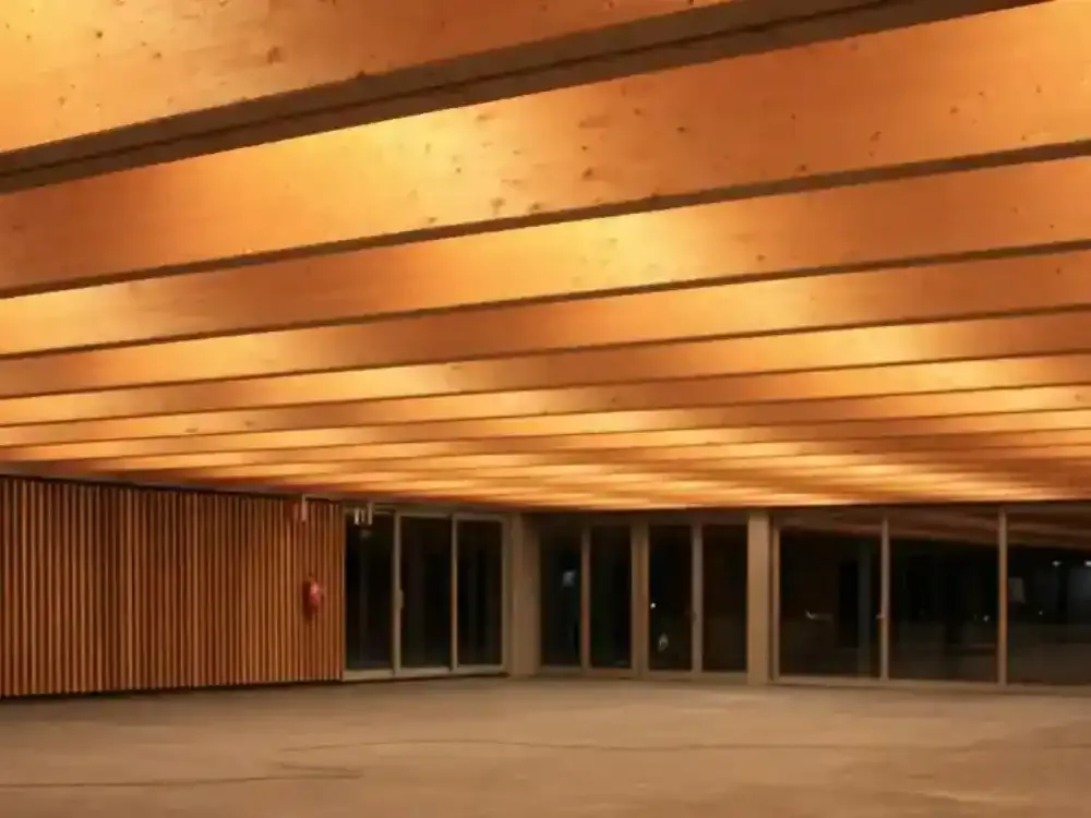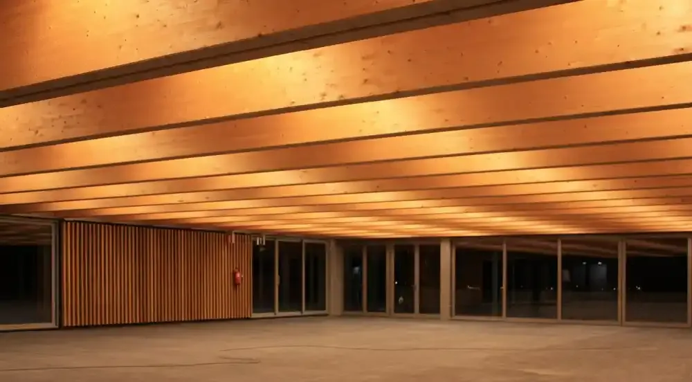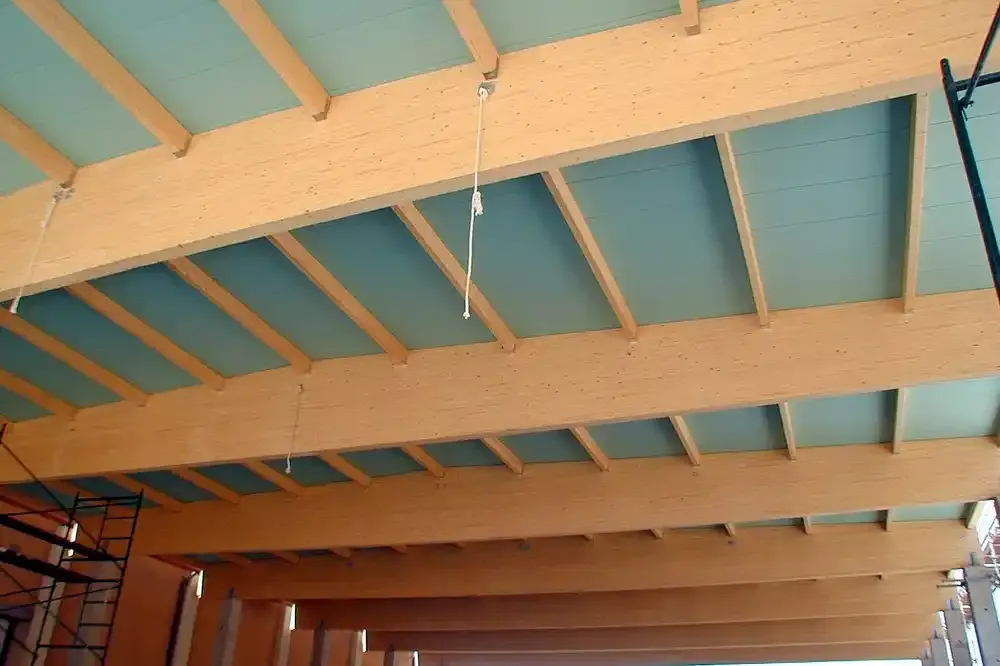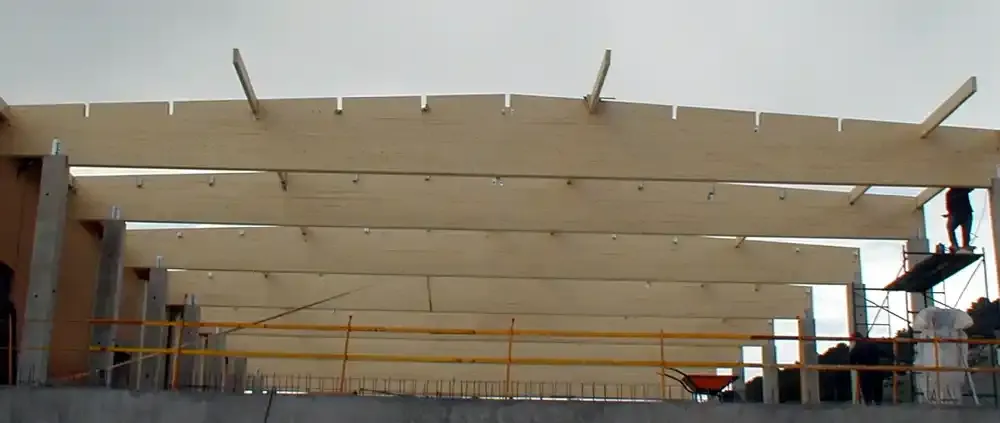 Ejecución de Cubierta con estructura de madera laminada y panel sándwich de madera.