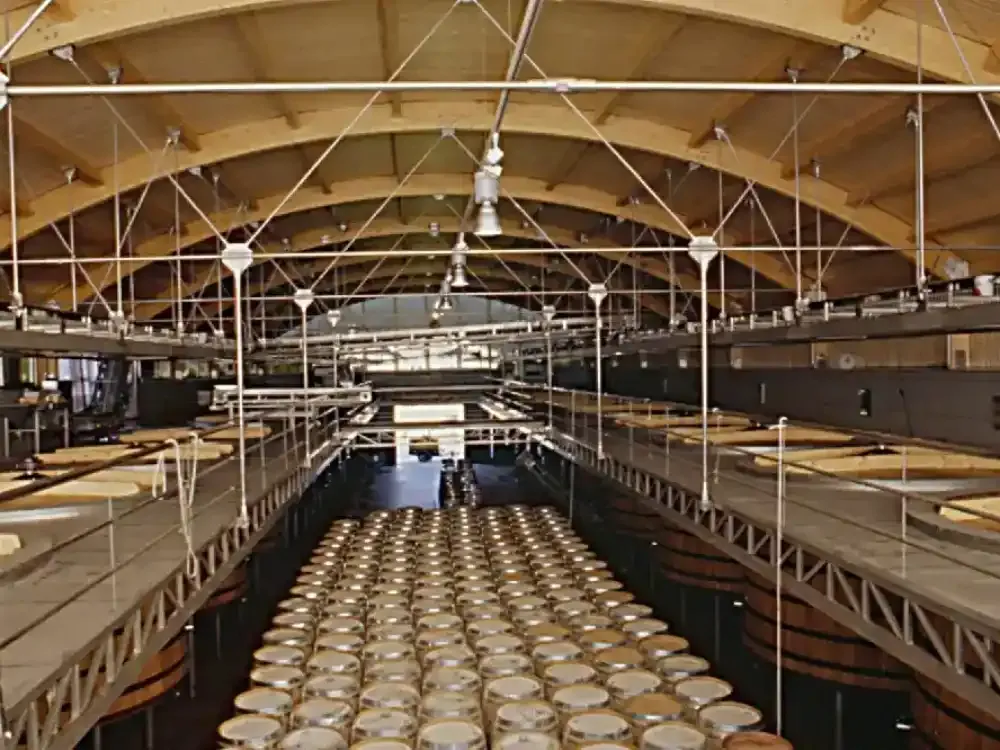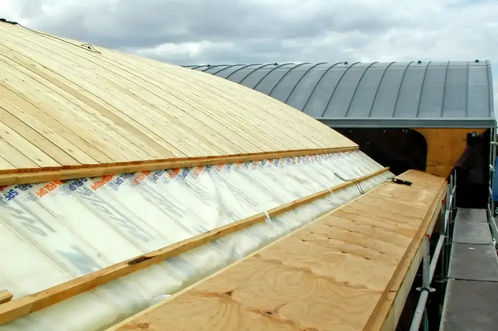 Ejecución de Cubiertas completas de varias naves con estructura de madera laminada curva, panel sándwich autoportante de madera, cubrición con chapa de zinc y canalones y bajantes de zinc.