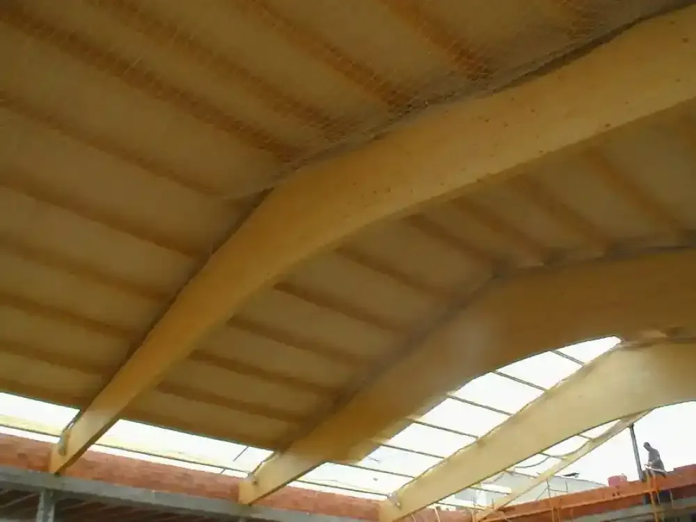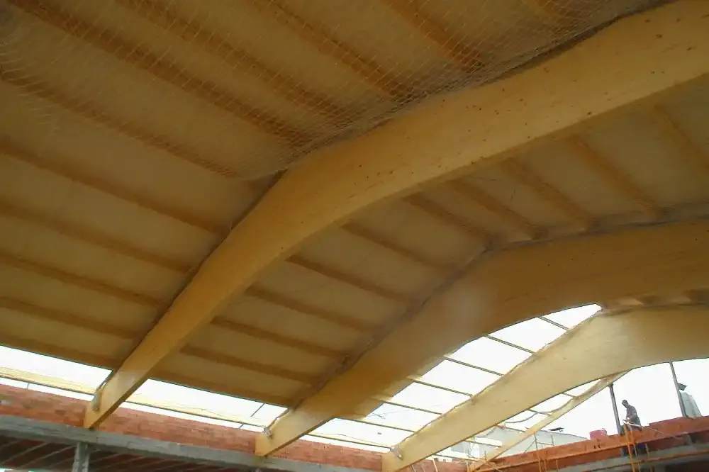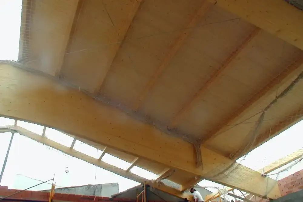 Ejecución de Cubierta con estructura de madera laminada y panel sándwich de madera.