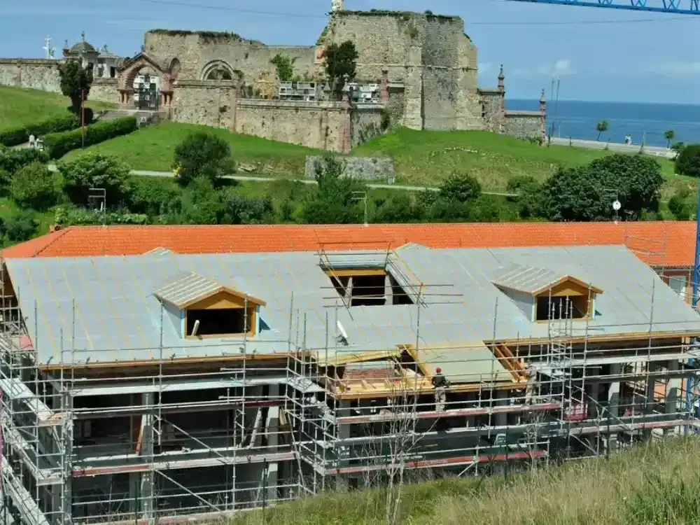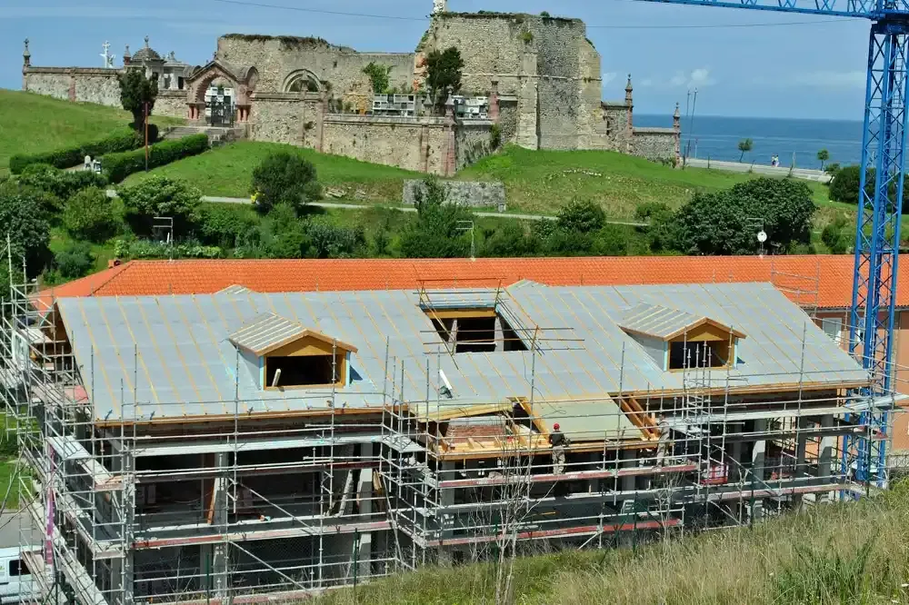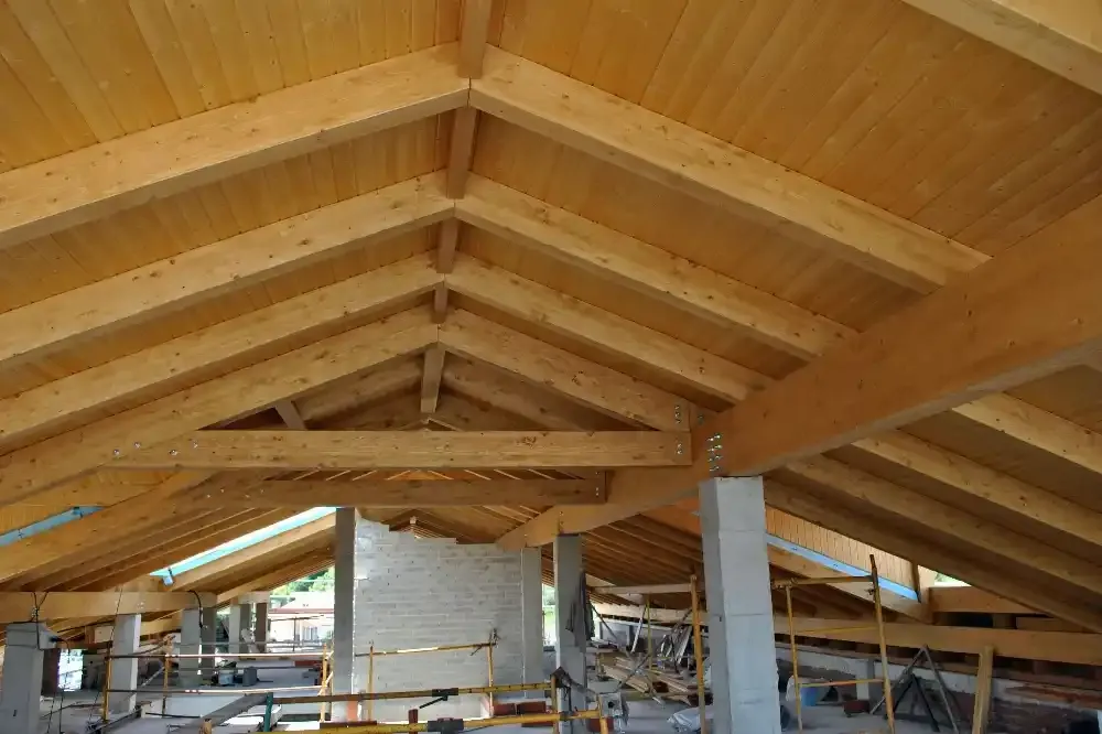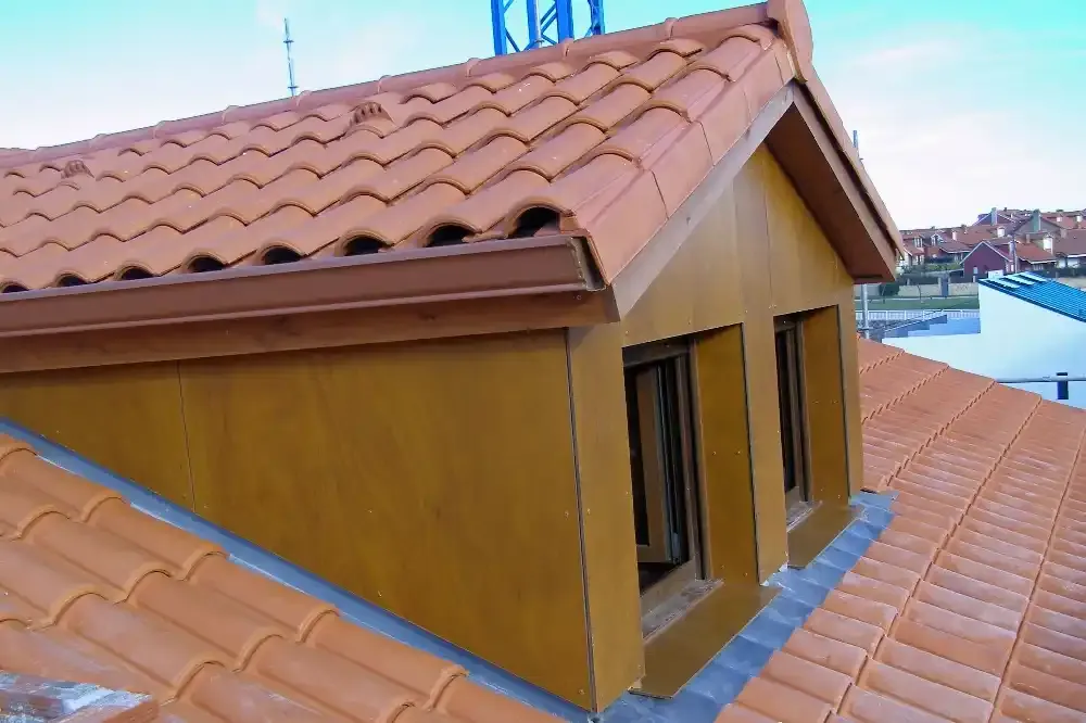 Ejecución de Cubierta con estructura de madera laminada y panel sándwich de madera. Forrado exterior de troneras con tablero baquelizado.