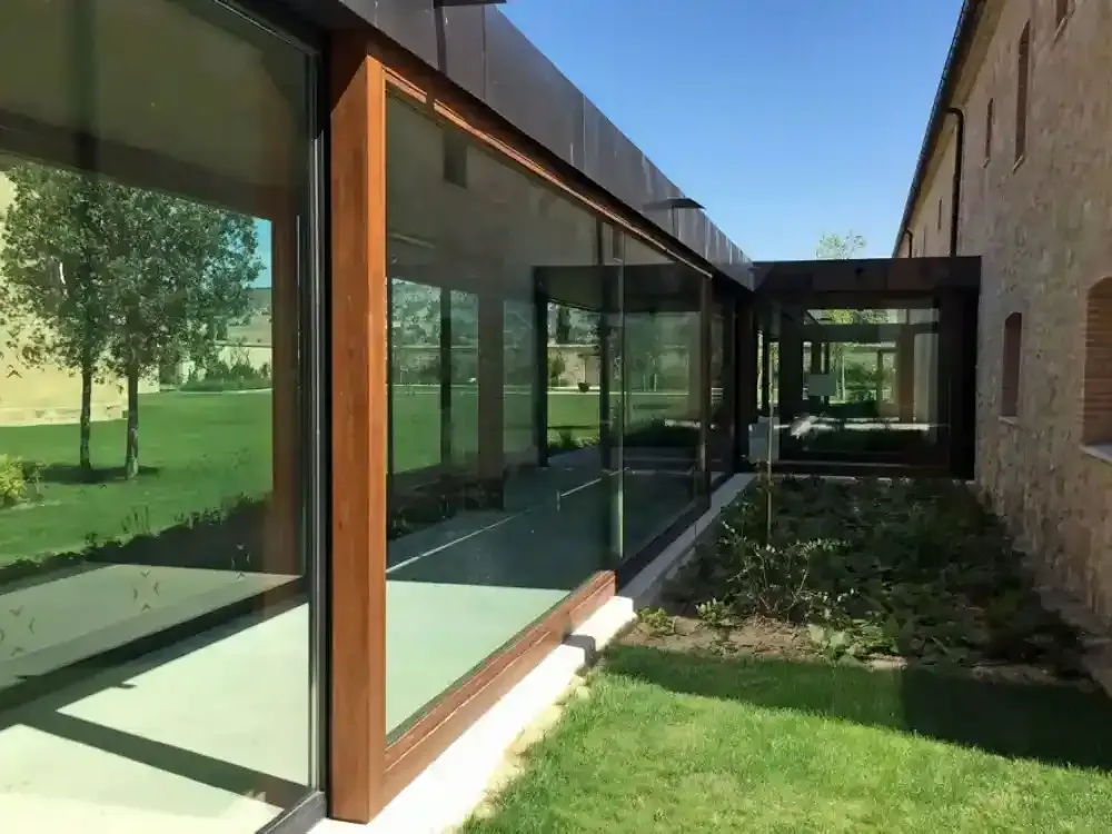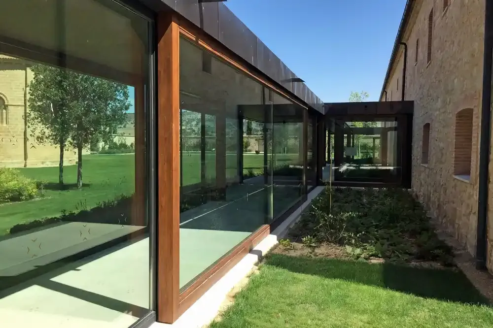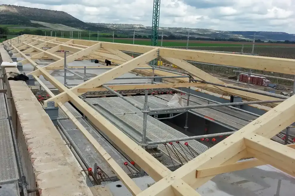Ejecución de Cubiertas completas con estructura de madera laminada de abeto, panel autoportante de madera y teja cerámica mixta y Edificio de conexión con estructura de madera laminada de abeto y CASTAÑO, pilares de madera laminada de CASTAÑO y cubierta con paneles autoportantes de madera y chapa de cobre.