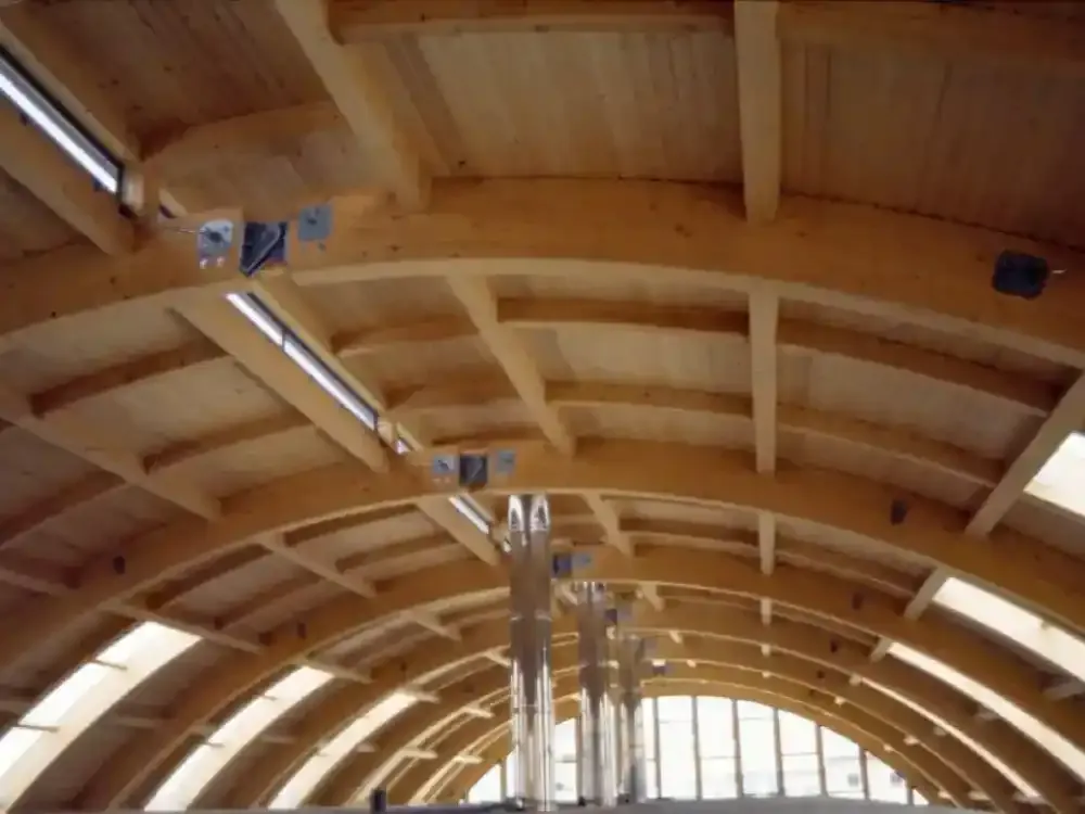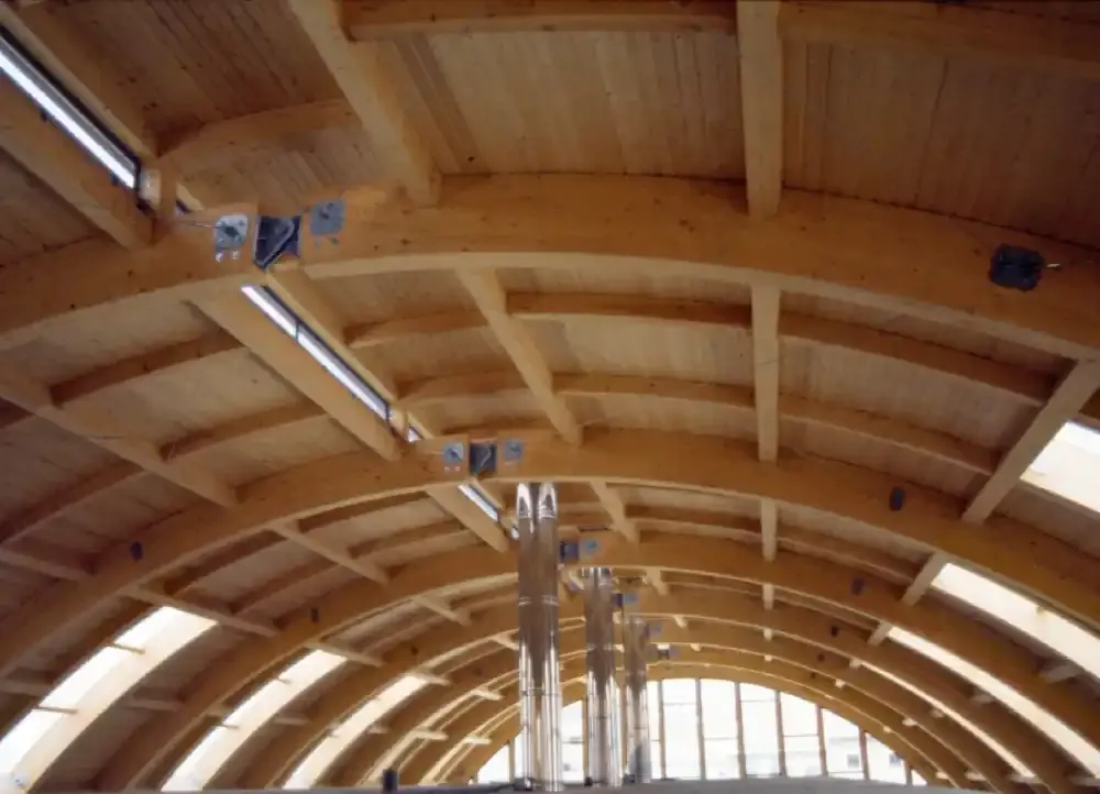 Ejecución de Cubierta completa con estructura de madera laminada curva, panel sándwich autoportante de madera, cubrición con chapa de zinc y policarbonato celular y canalones y bajantes de zinc.
