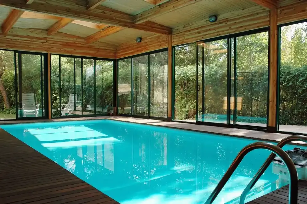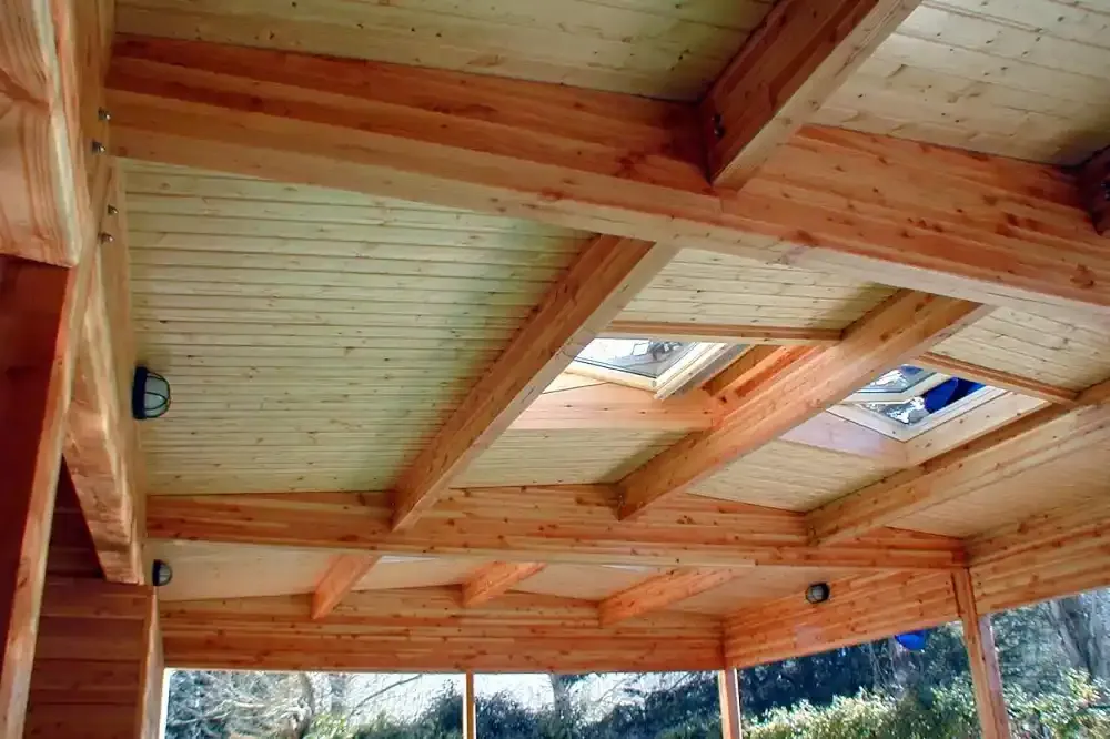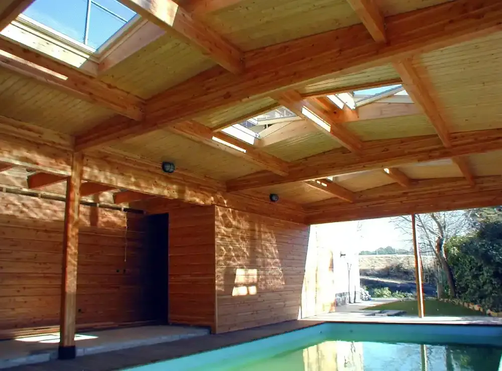 Ejecución de Cubierta completa con estructura de madera laminada de PINO DOUGLAS, pilares de la misma madera, panel sándwich autoportante de madera, ventanas de cubierta, cubrición con chapa de cobre y canalones y bajantes de cobre. Forrado de paramentos verticales interiores y exteriores con Bardage Collé de Pino Douglas. Entarimado de suelo de piscina con duela de Ipé.