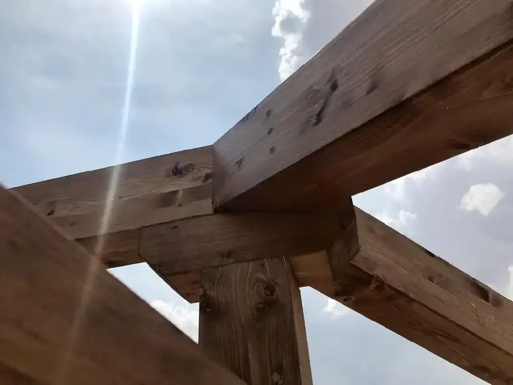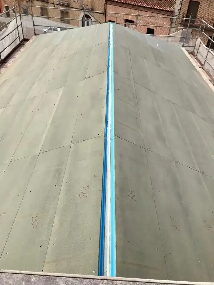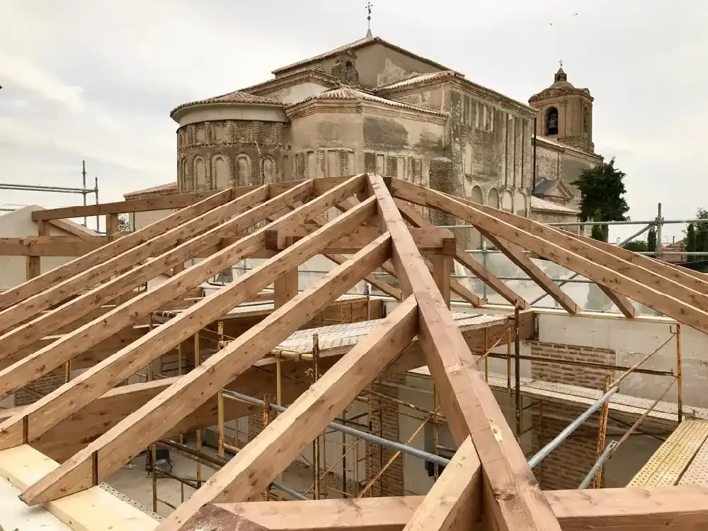Ejecución de cubierta con estructura de madera laminada de abeto y panel sándwich de madera acabado en tarima.