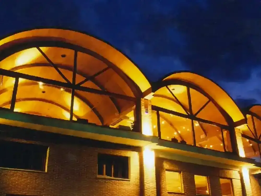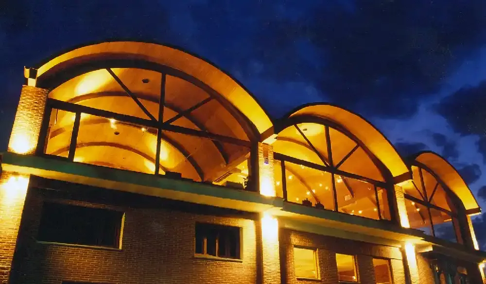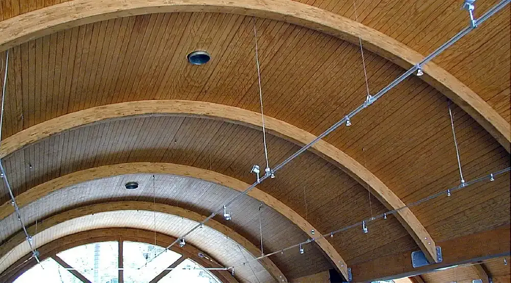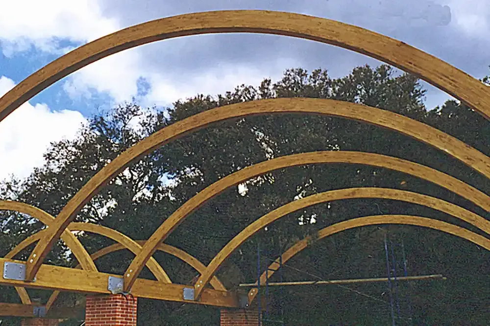 Ejecución de Cubierta con estructura de madera laminada curva y panel sándwich autoportante de madera.