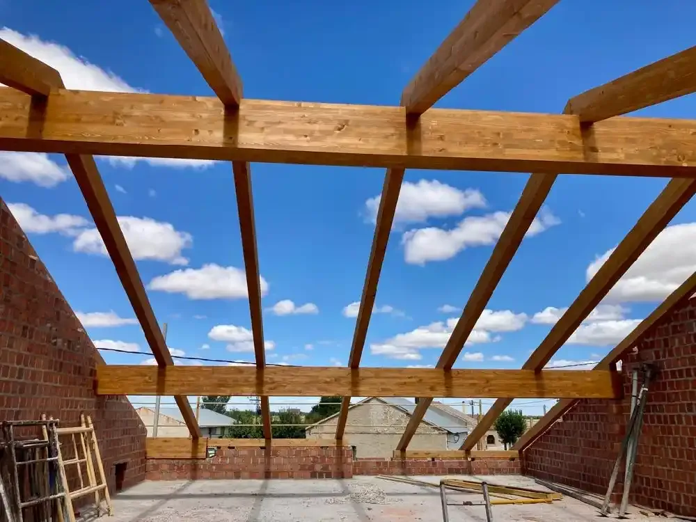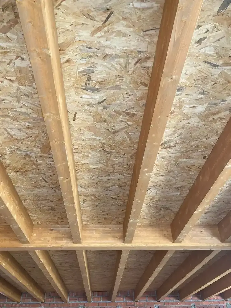 Ejecución de Forjado con estructura de madera laminada y tablero OSB, y ejecución de Cubierta con estructura de madera laminada y panel sándwich de madera en diferentes acabados.